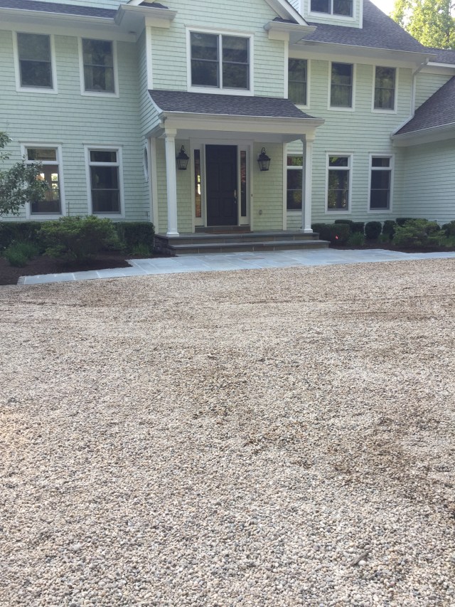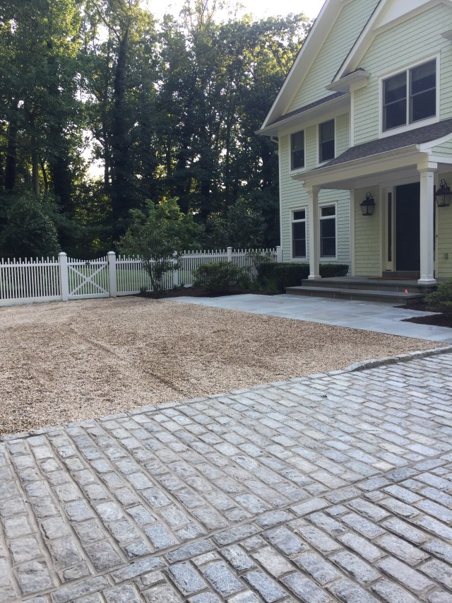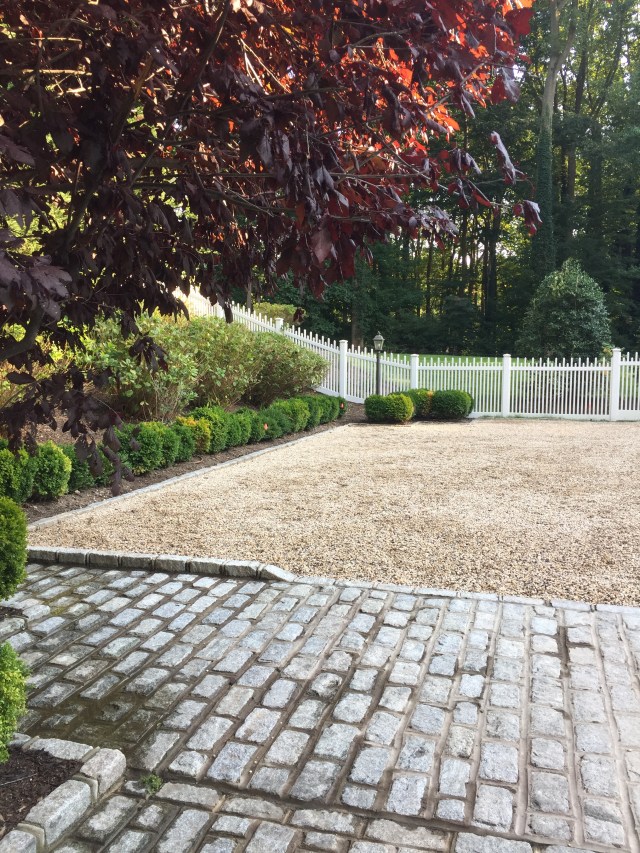 With the white fence in, the hard scape seems fairly complete. Next I’d like to rip out the boxwoods surrounding the courtyard as they’re not very happy. This is the one area I’d like to see fairly formal. I’m looking to take everything out (except the small tree) on either side of the stoop under the windows. The plan is a backdrop of blue and white hydrangeas. Some of them in bush form and a few tree standards to play with elevation. Next put a dwarf hedge a foot or so in from the Belgian block pavers. That way I can do white annuals and dusty miller in front. I will drop containers here and there. Hoping for a real Hamptons/Cape Cod vibe!