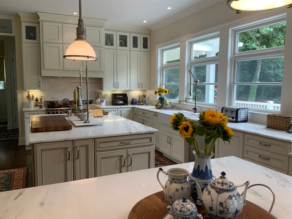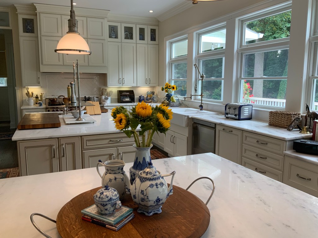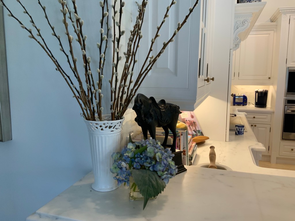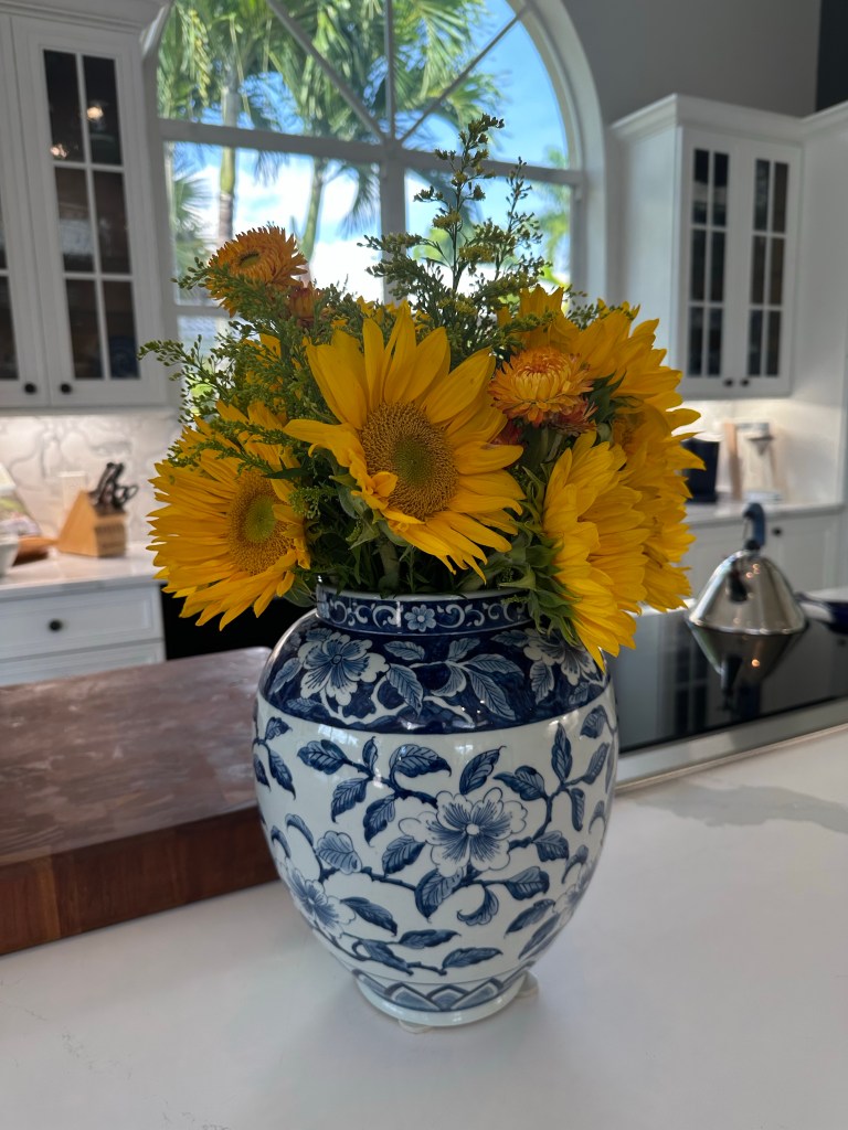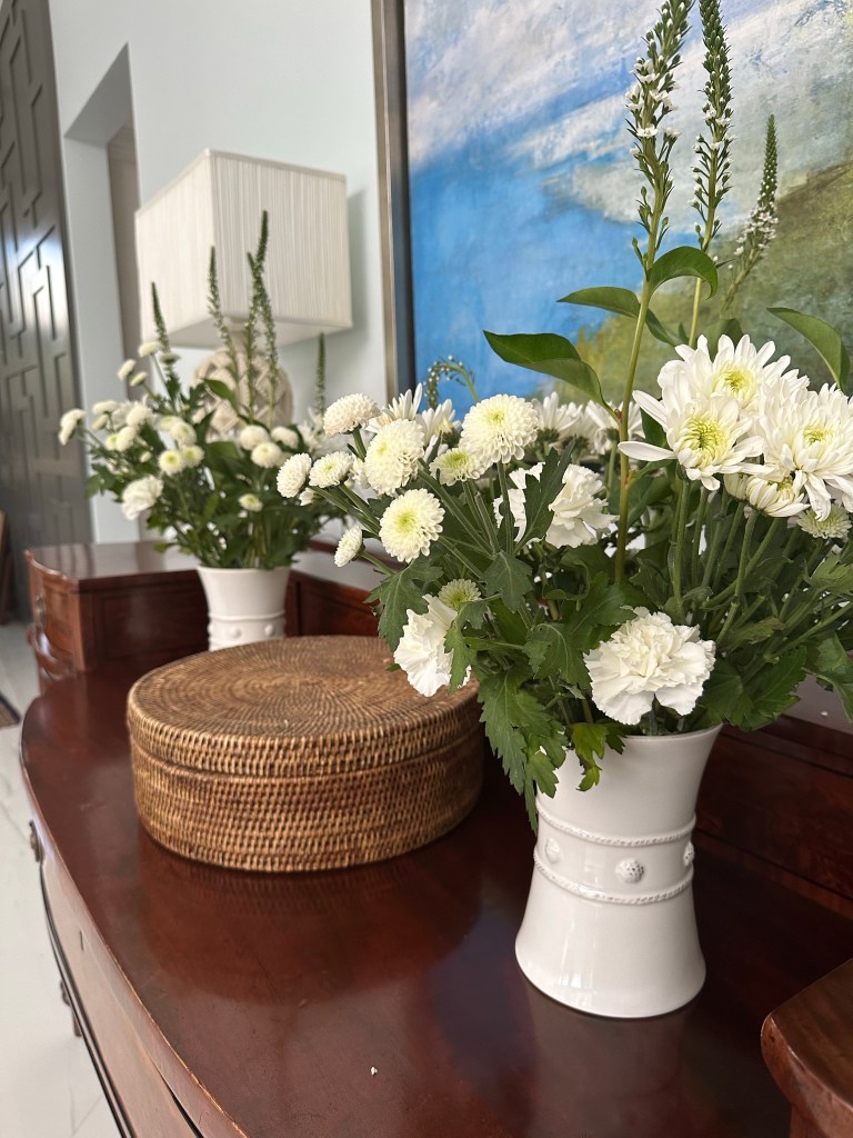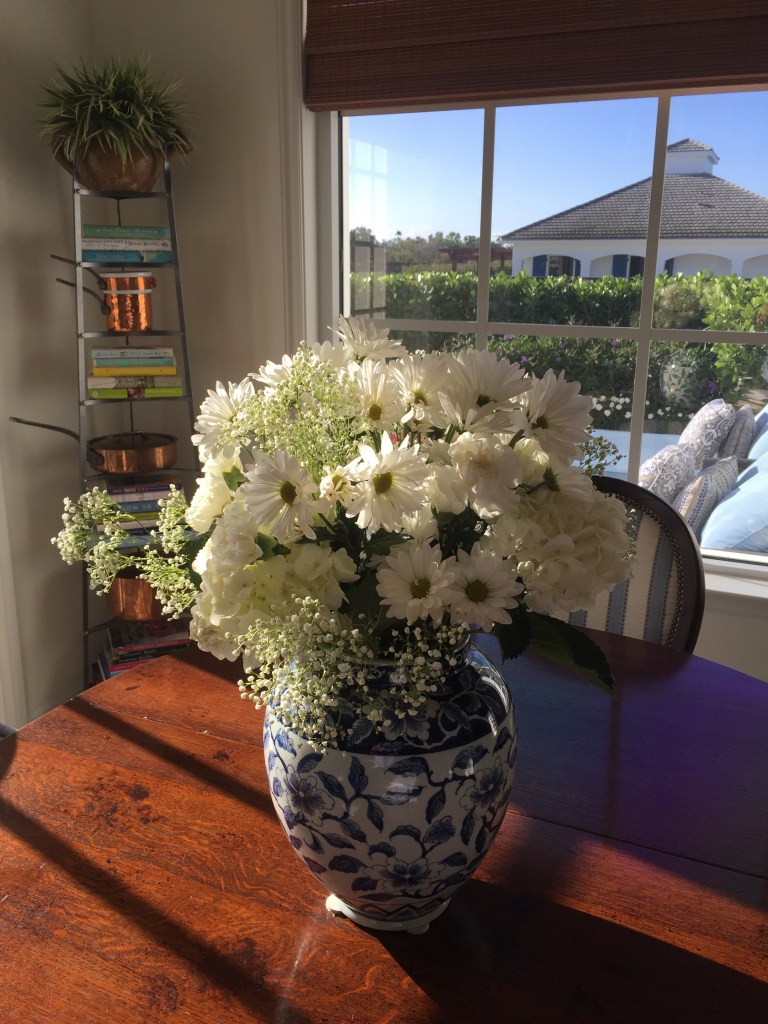 This weekend’s flowers in the Cove House South kitchen. Sunflowers in a blue and white vase are very much a signature look.White flowers in the living room. White flowers are always a theme.