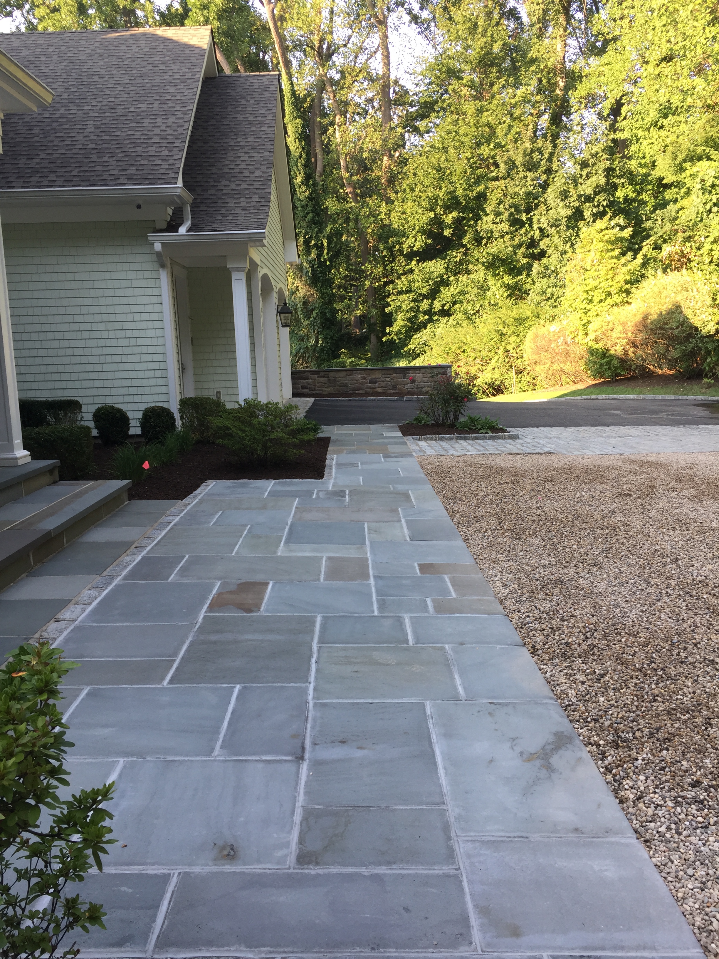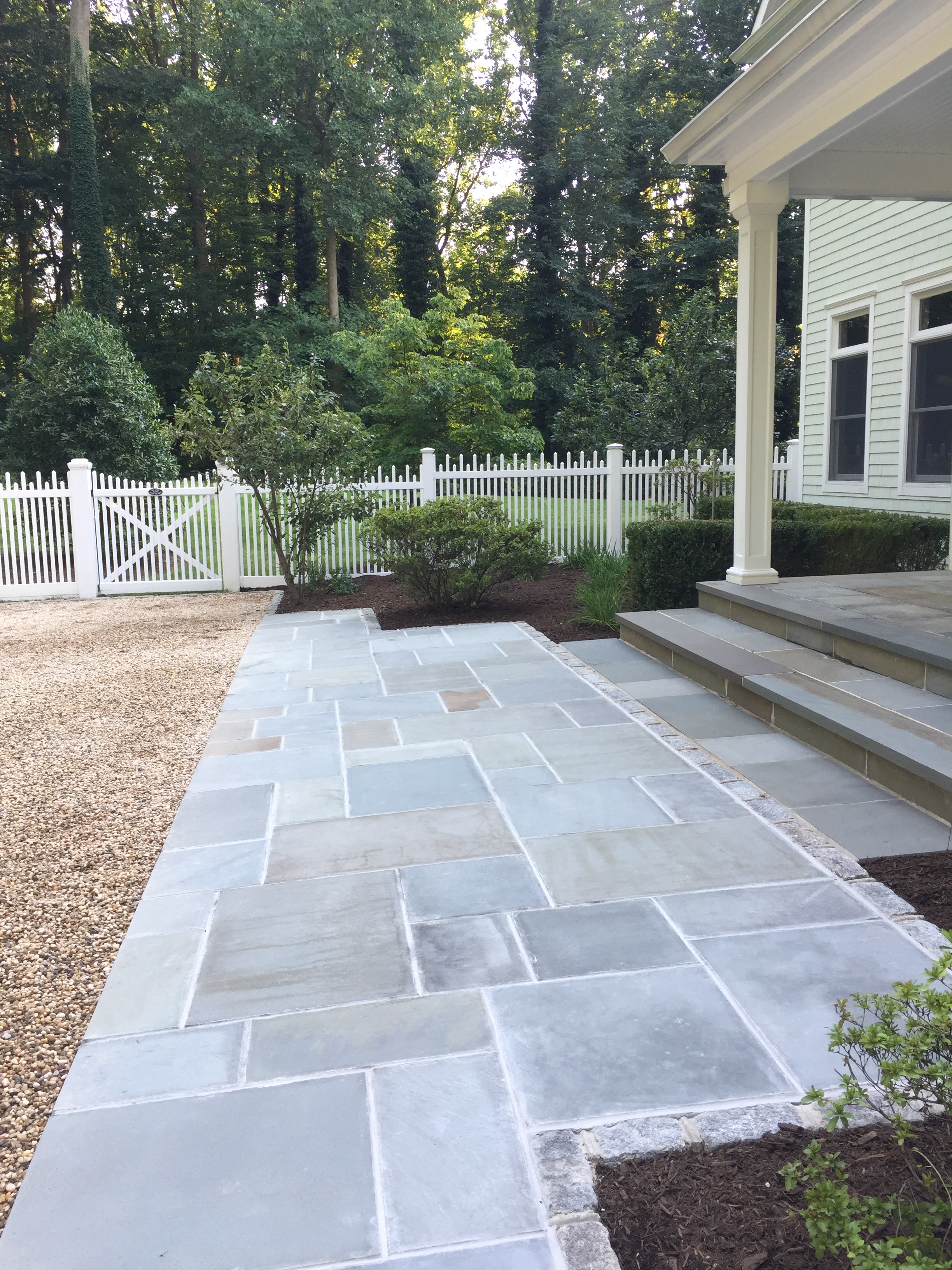 With the white fence in, the hard scape seems fairly complete. Next I’d like to rip out the boxwoods surrounding the courtyard as they’re not very happy. This is the one area I’d like to see fairly formal. I’m looking to take everything out (except the small tree) on either side of the stoop under the windows. The plan is a backdrop of blue and white hydrangeas. Some of them in bush form and a few tree standards to play with elevation. Next put a dwarf hedge a foot or so in from the Belgian block pavers. That way I can do white annuals and dusty miller in front. I will drop containers here and there. Hoping for a real Hamptons/Cape Cod vibe!