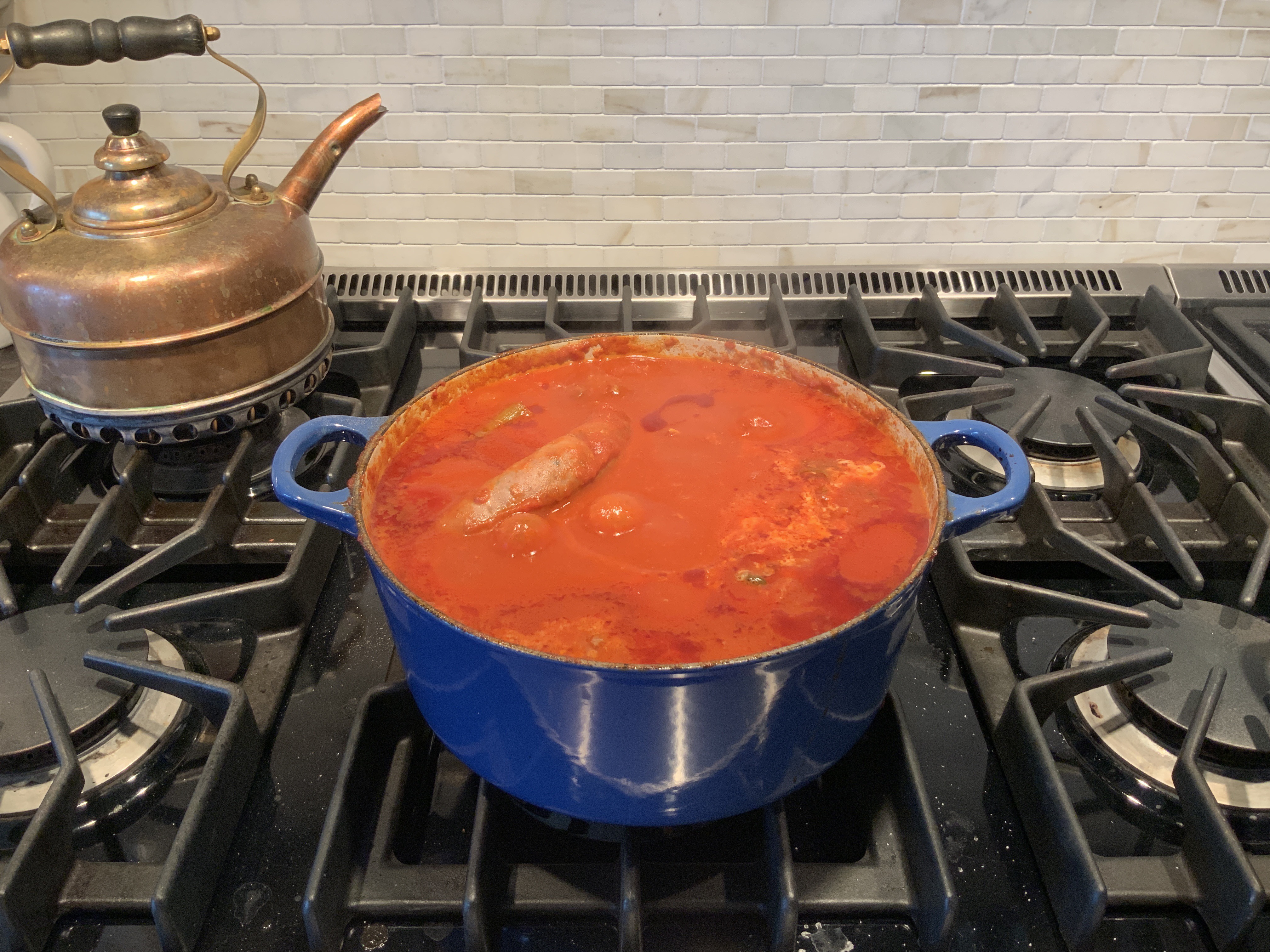 I’m cooking this afternoon. A huge pot of tomato sauce is simmering away on the Viking. Then back to my book.