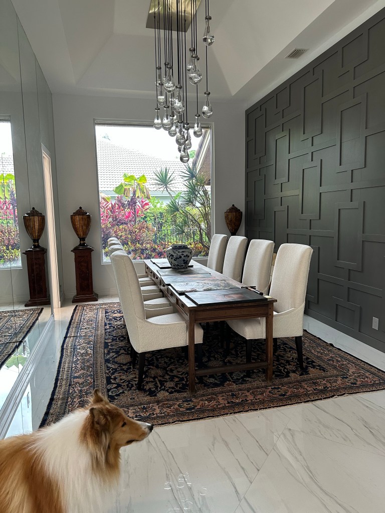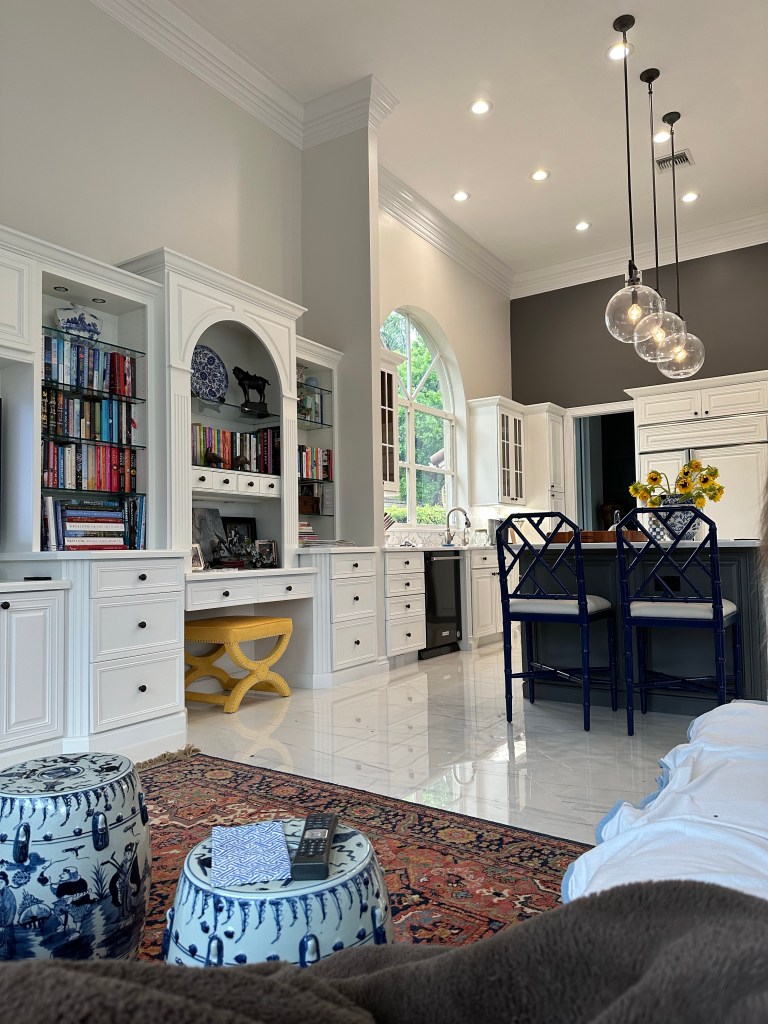 What drew us was a great screened in patio and pool, plus a revamped interior. The previous owner took what was high ceilings, dark paneled public rooms and spun it modern. While we not purchase her furniture, we did keep her modern chandeliers, kept the pale robin’s egg blue in the living room, and the existing gray and white in kitchen dining room.